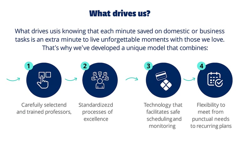 What drives us is knowing that each minute saved on domestic or business tasks is an extra minute to live unforgettable moments with those we love. That’s why we've developed a unique model that combines: